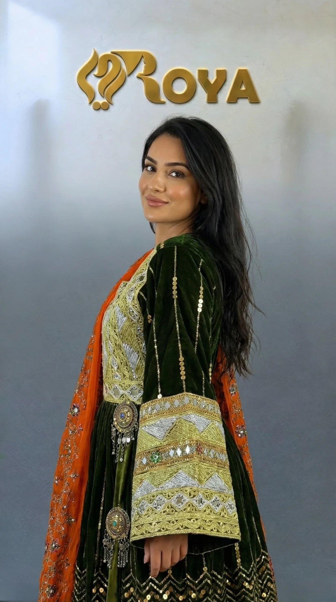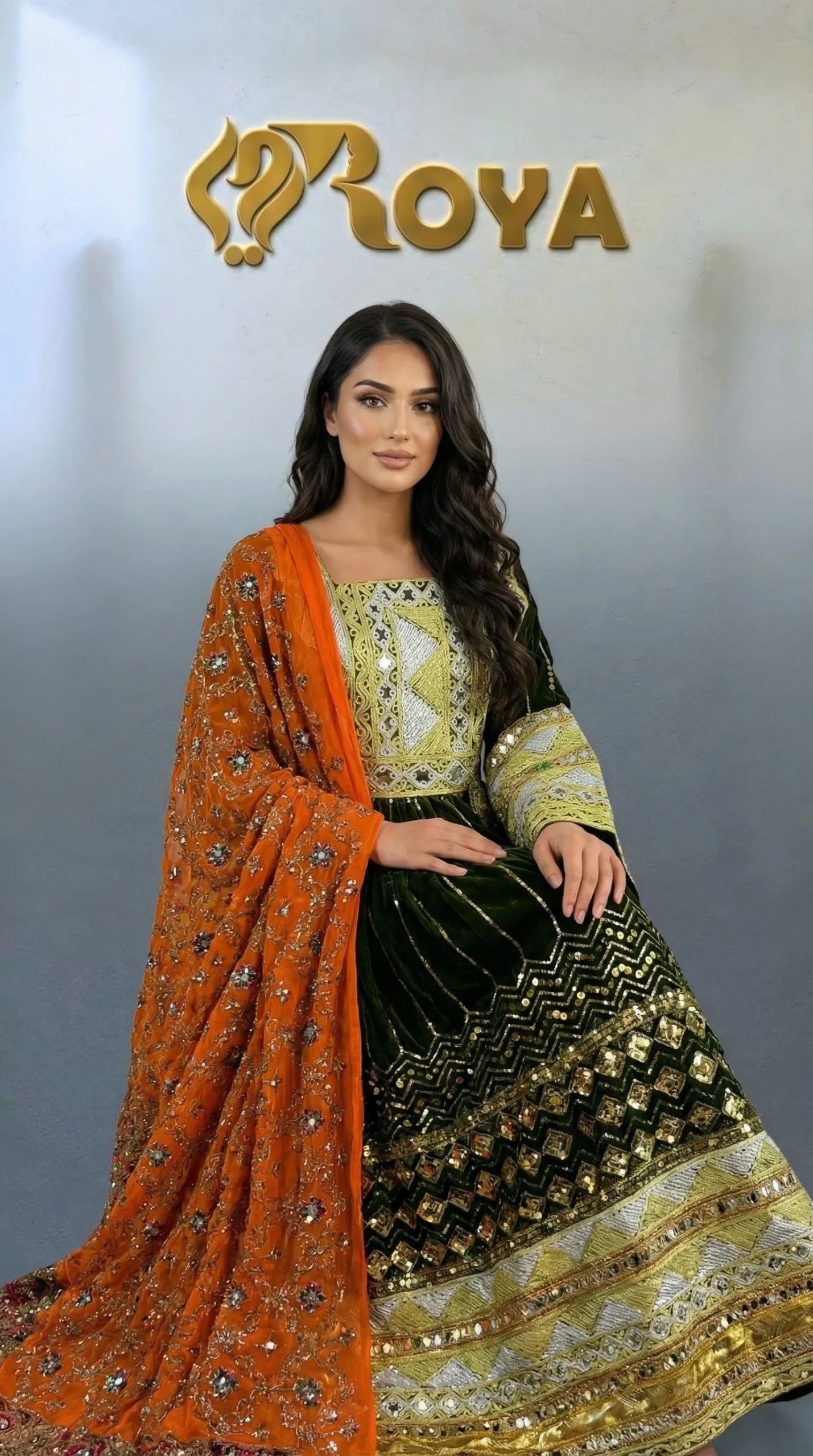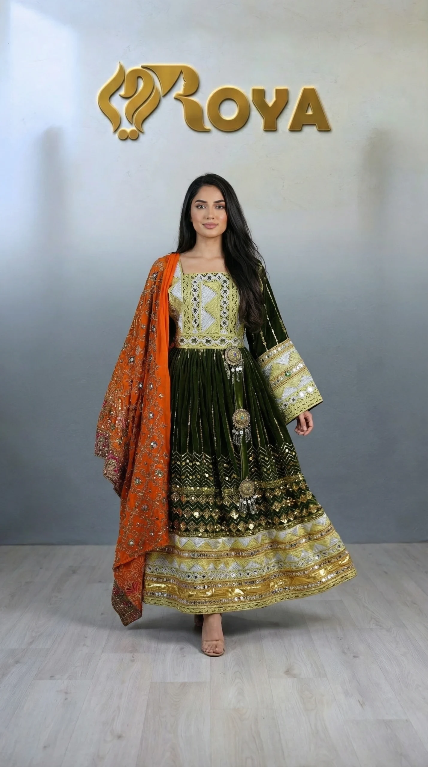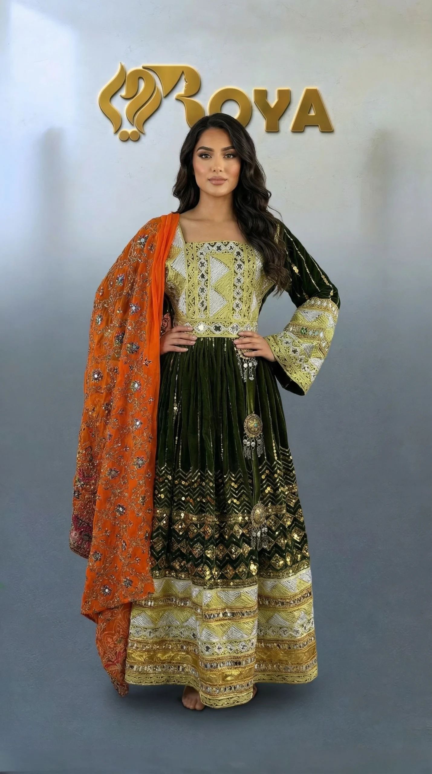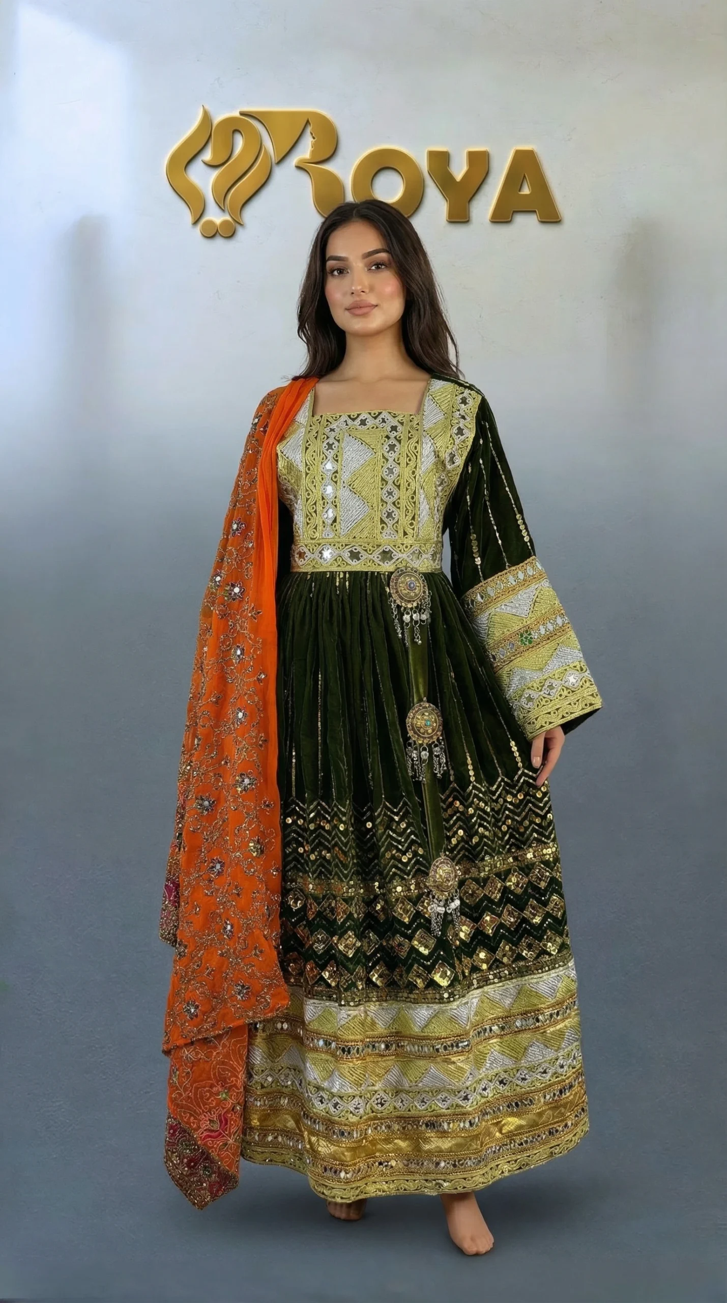 An elegant Afghan Kochi dress featuring deep olive-green tones, intricate gold embroidery, and a contrasting orange dupatta, designed for timeless cultural beauty.