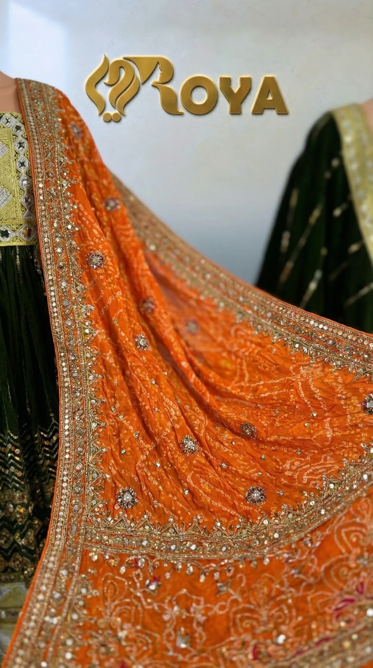The flowing olive-green skirt is richly decorated with gold woven detailing and ornamental motifs, creating a regal and balanced silhouette. The contrasting orange dupatta, adorned with fine embroidery, adds warmth and vibrancy to the overall look. Intricately designed sleeves and borders complete the dress with a luxurious finish.