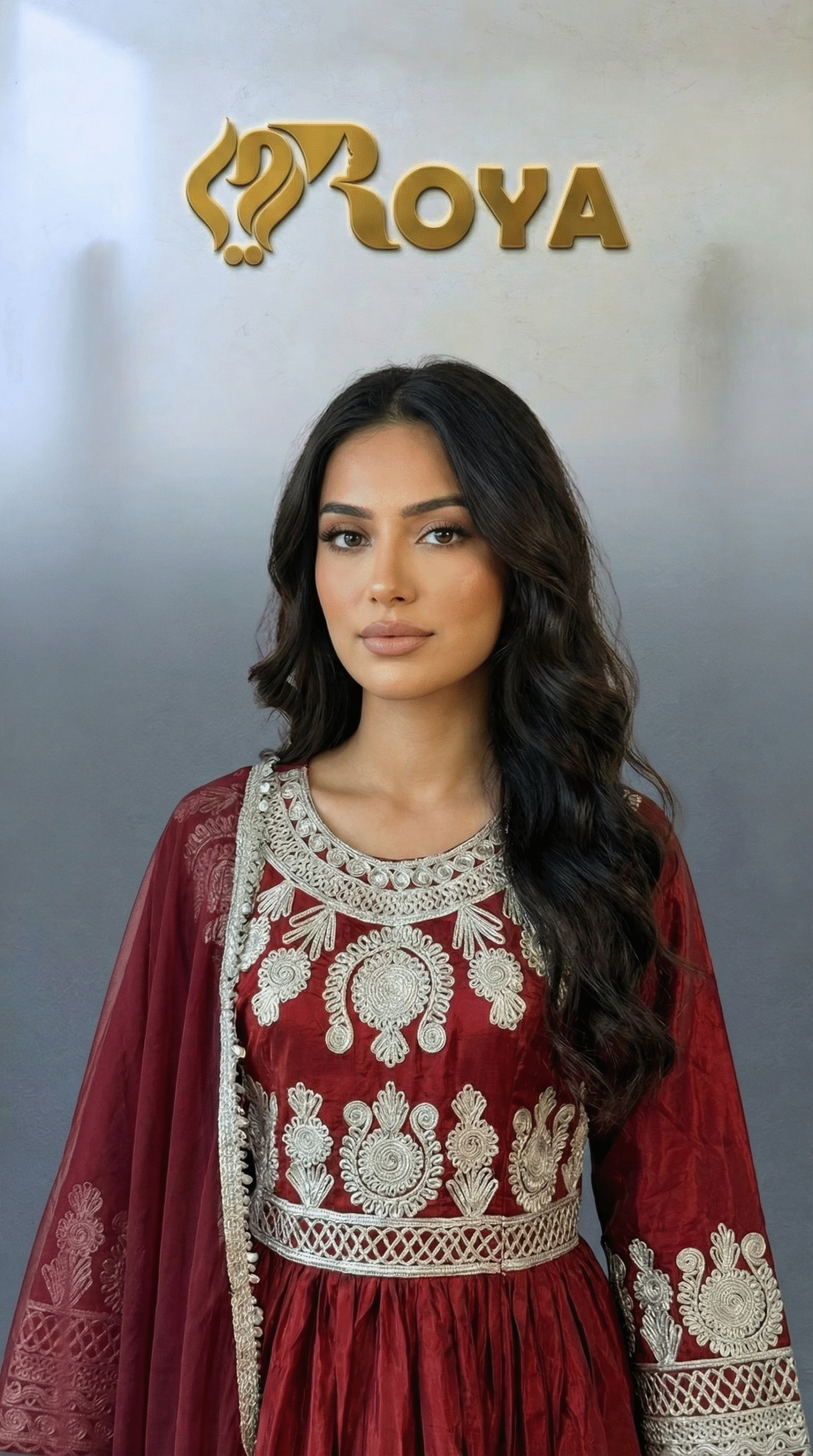 The Arezoo Kochi Dress embodies classic Afghan elegance with a refined and graceful design. Crafted in a rich deep maroon red tone, this traditional Afghan dress features beautifully detailed ivory-colored embroidery inspired by heritage Kochi patterns.