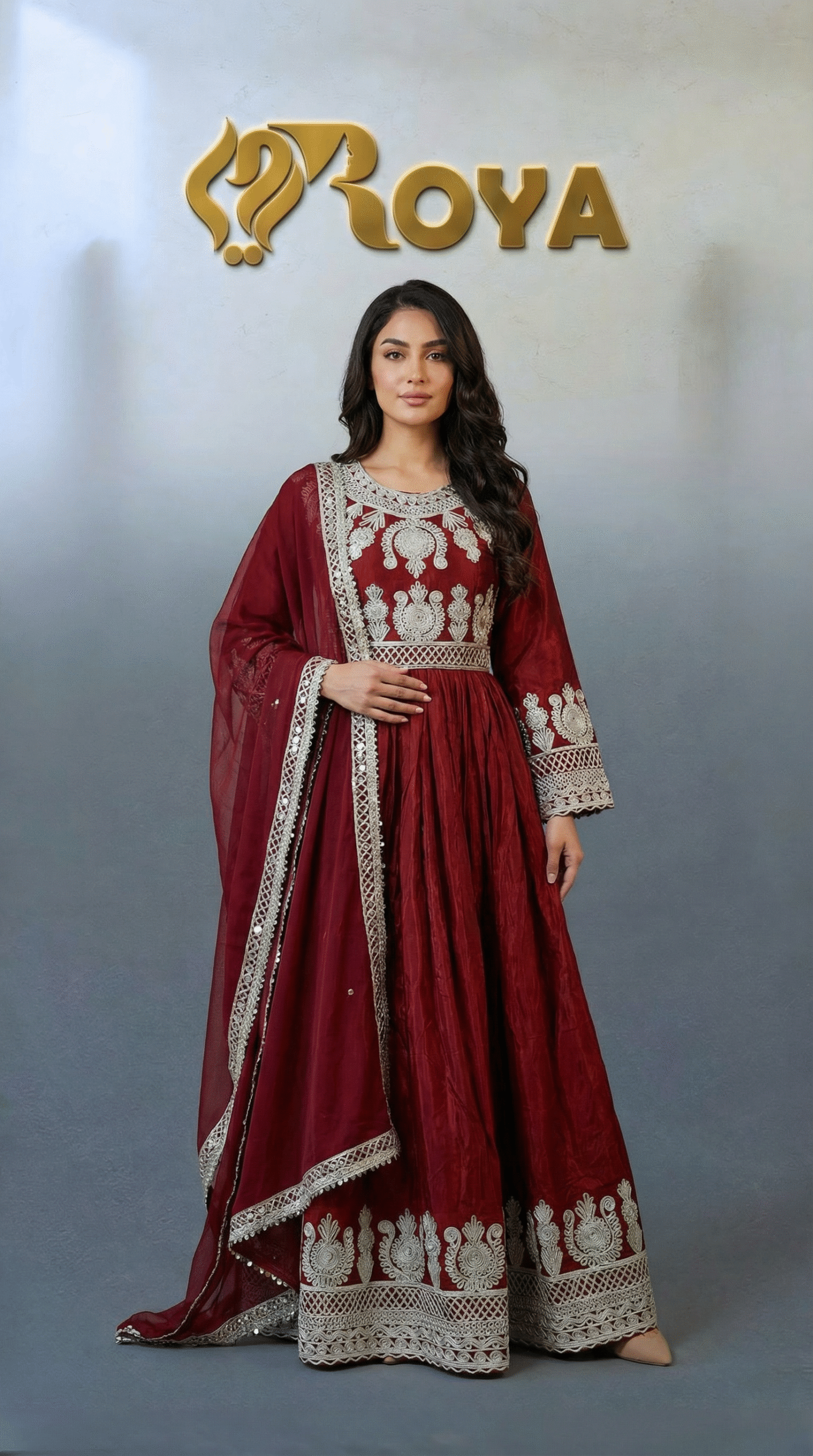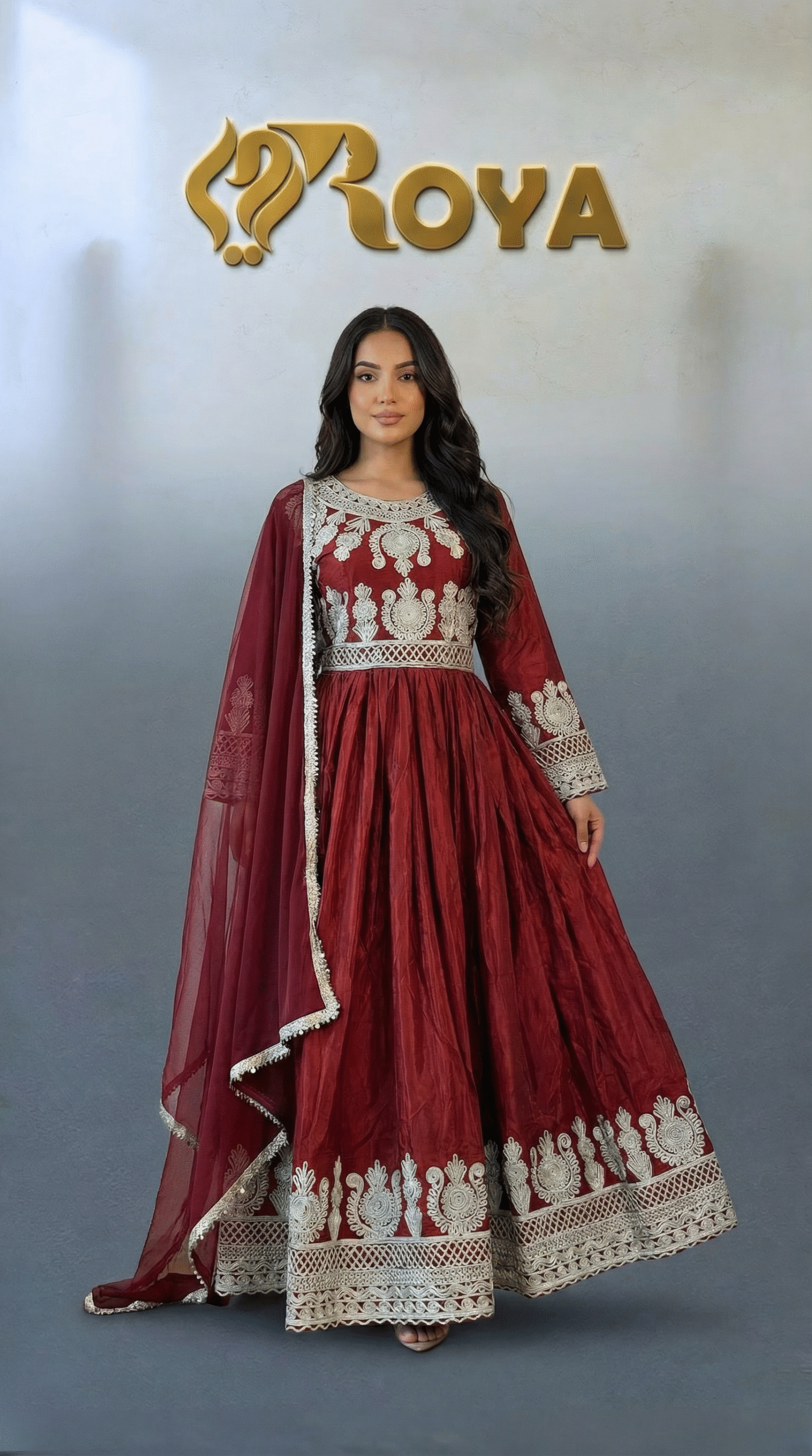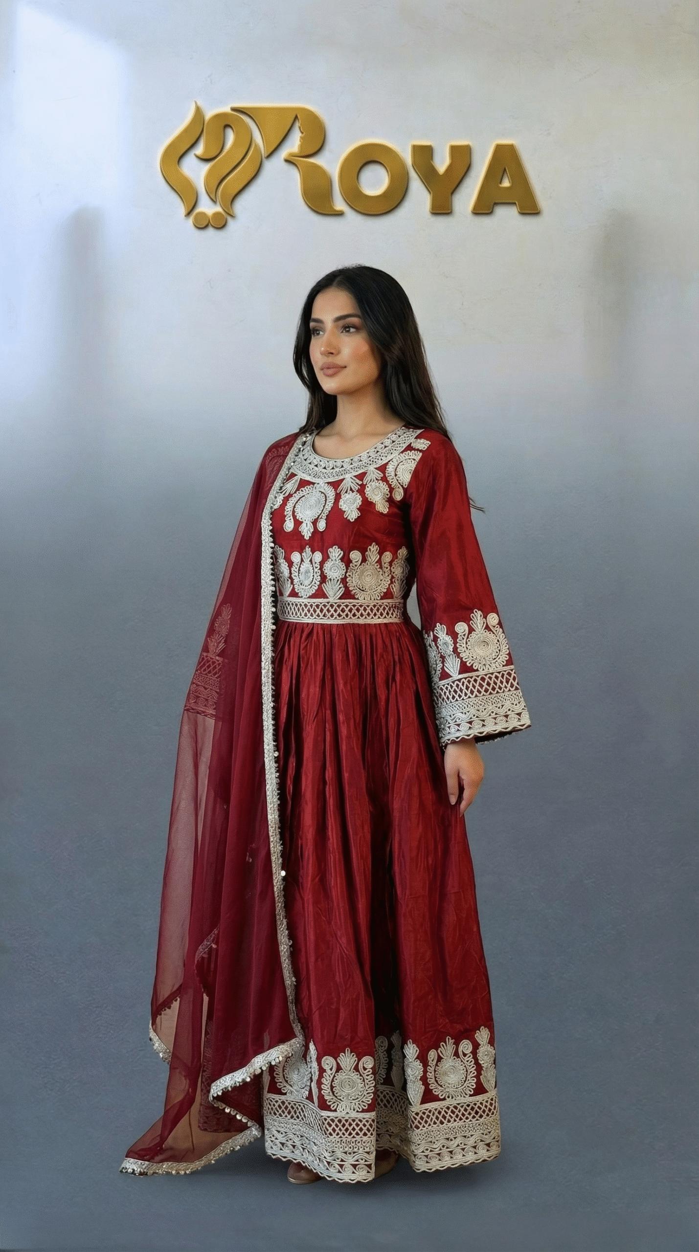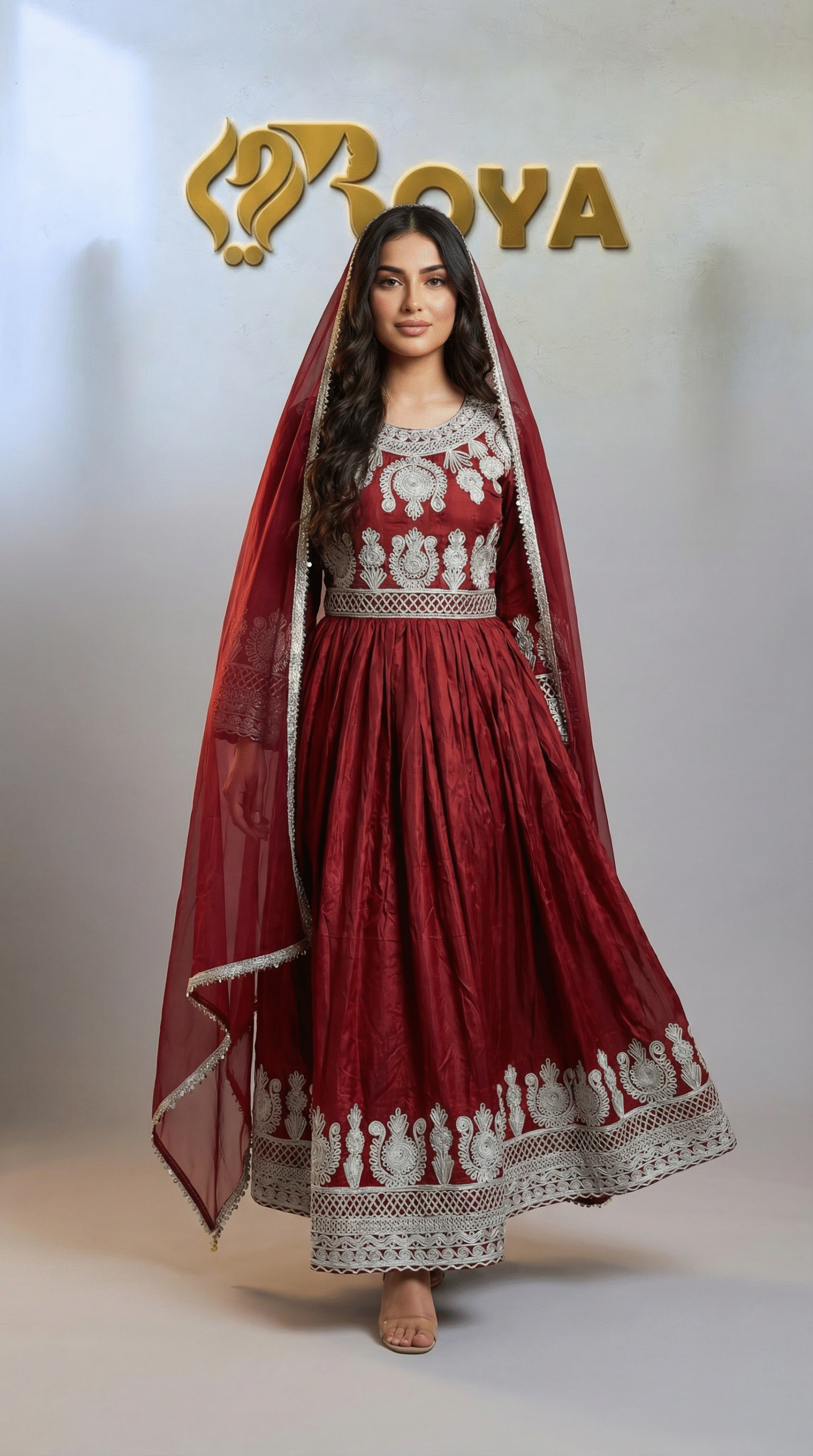 An elegant Afghan Kochi dress in deep maroon red, adorned with delicate ivory embroidery and a matching sheer dupatta. A timeless choice for weddings and cultural celebrations.