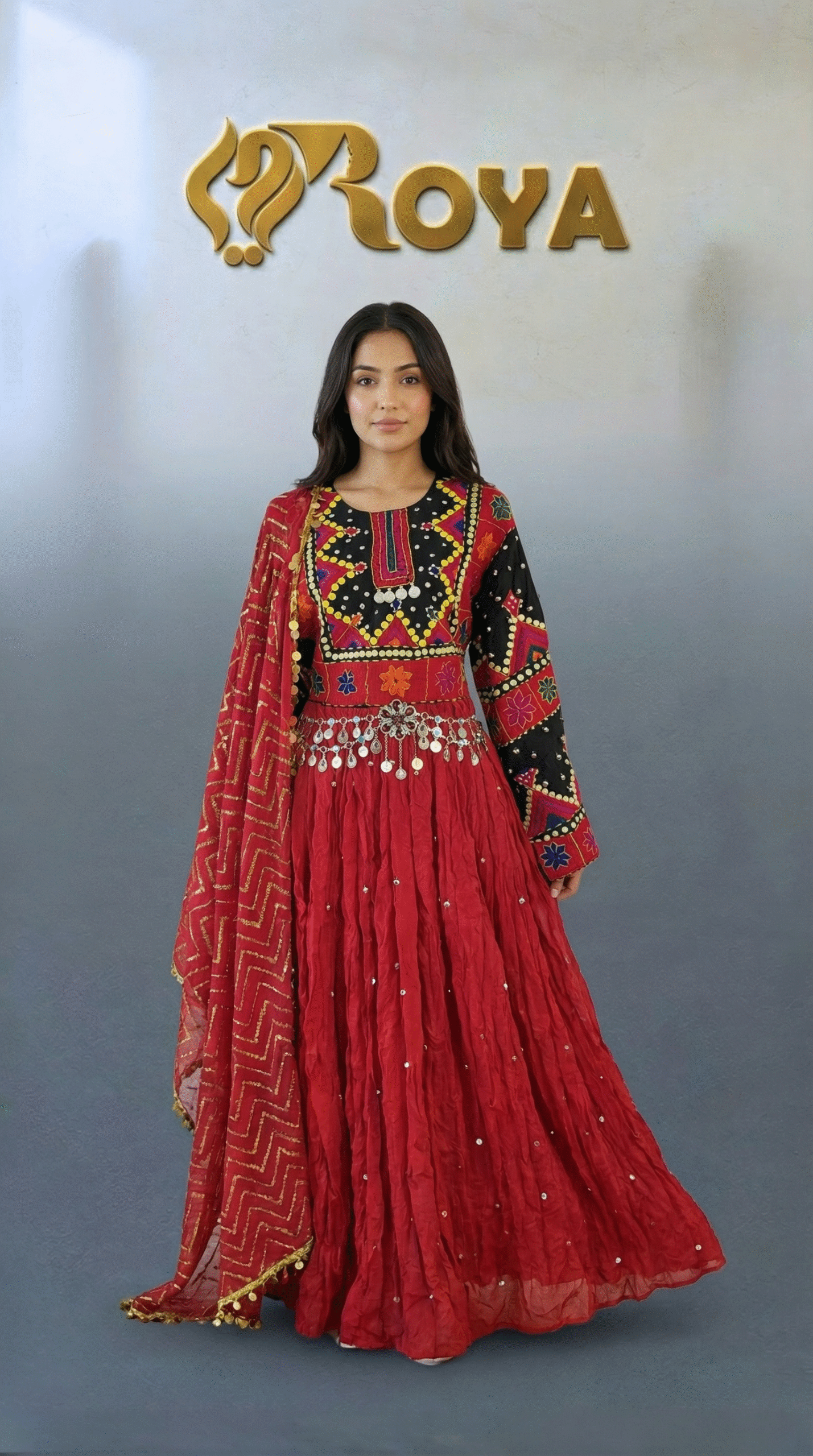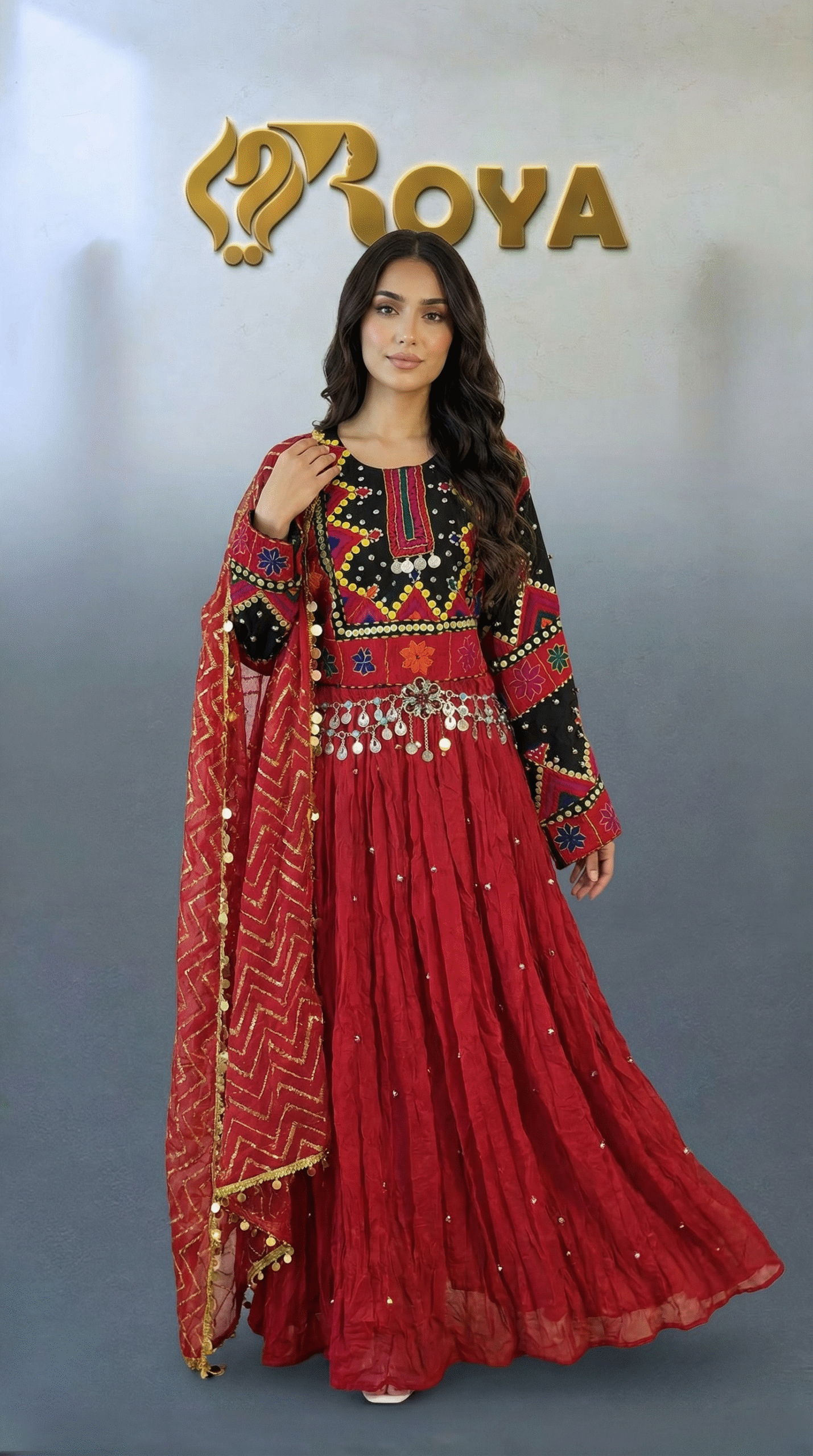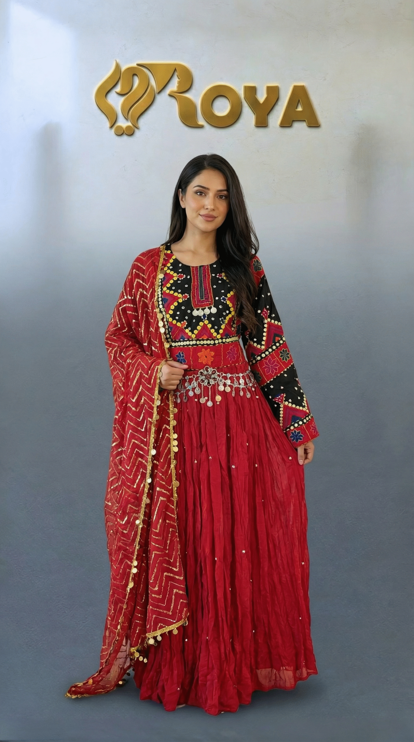 The deep red flowing skirt creates a dramatic and graceful movement, while the contrasting black embroidered sleeves add strength and character to the design. The matching red dupatta with delicate detailing completes the look, making this dress ideal for weddings, cultural celebrations, Eid, and special events.