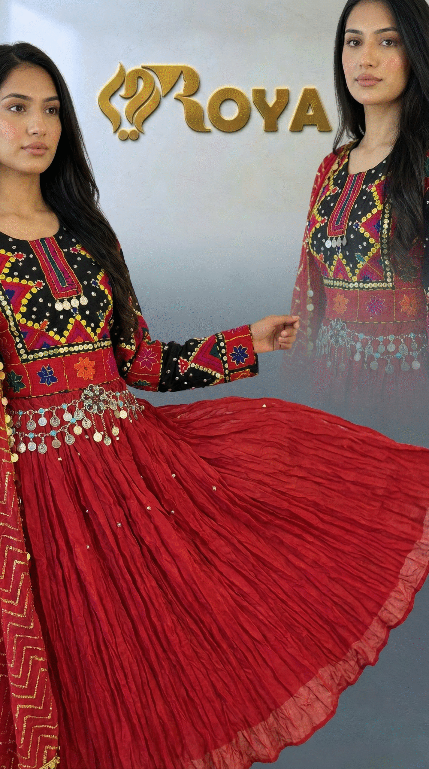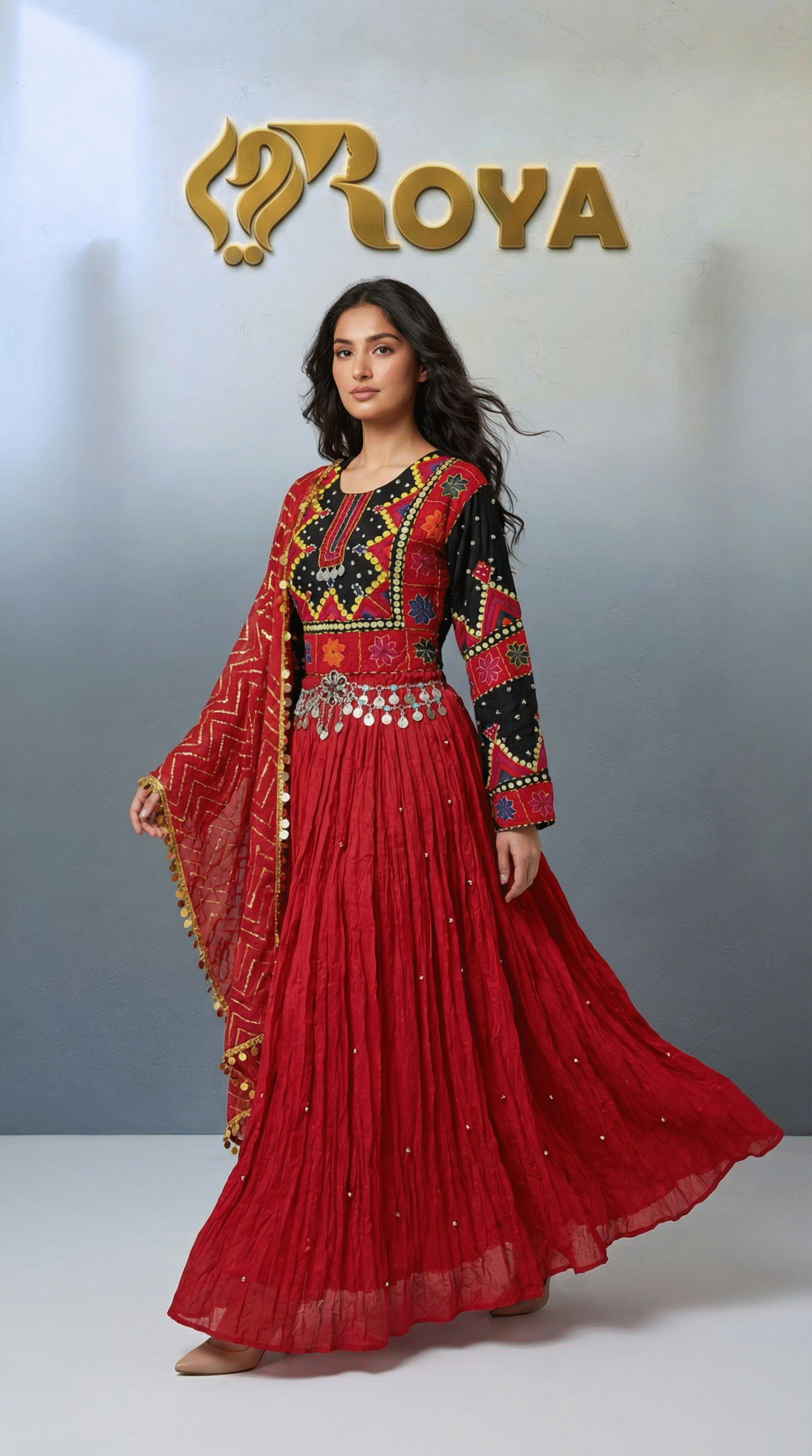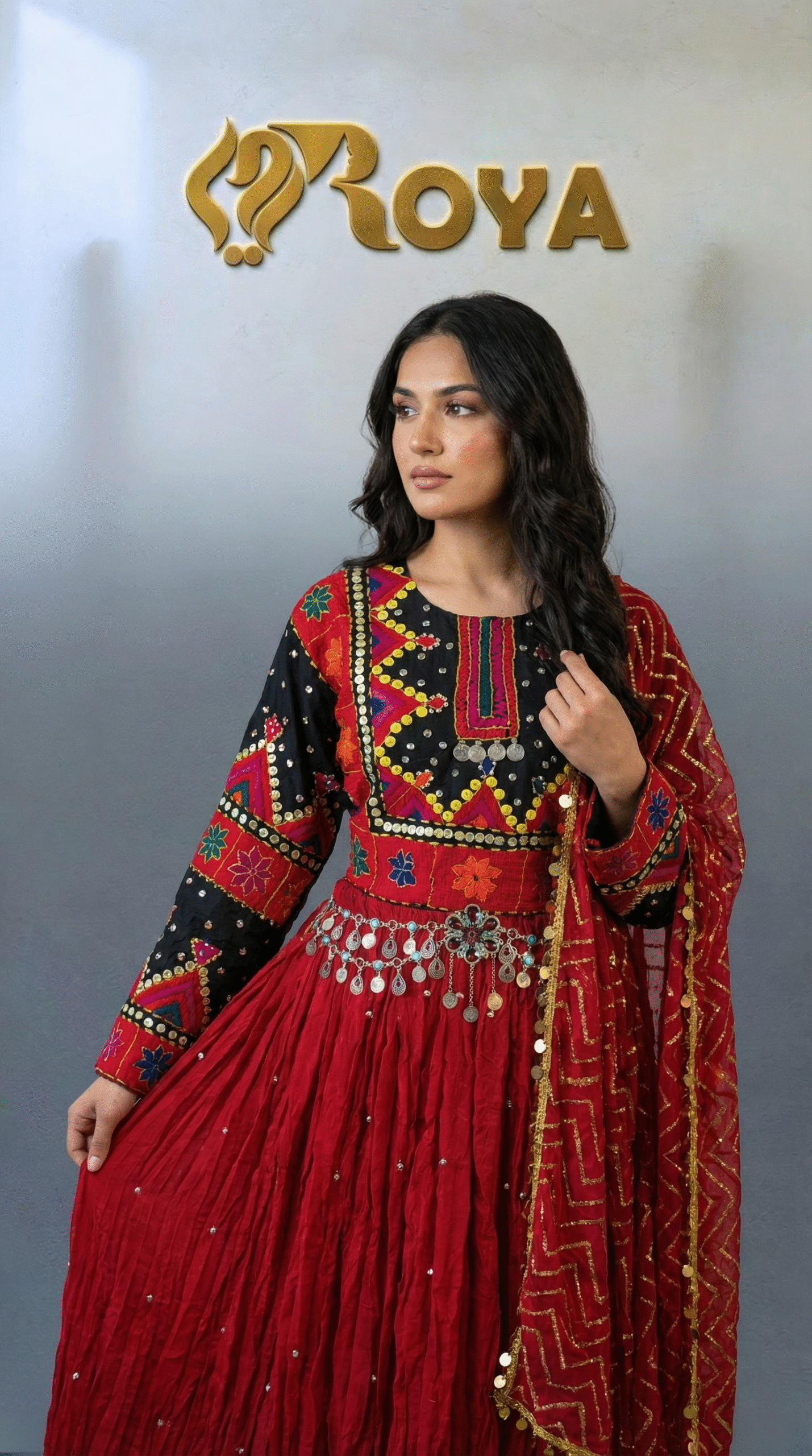 The deep red flowing skirt creates a dramatic and graceful movement, while the contrasting black embroidered sleeves add strength and character to the design. The matching red dupatta with delicate detailing completes the look, making this dress ideal for weddings, cultural celebrations, Eid, and special events.