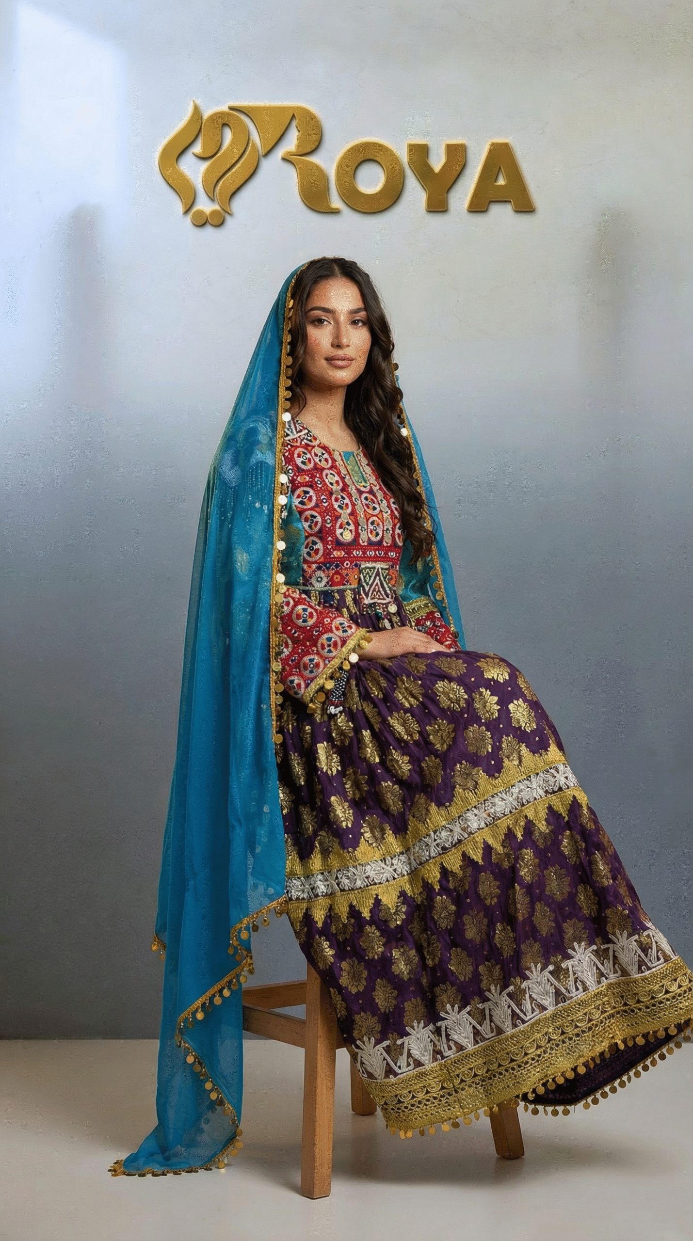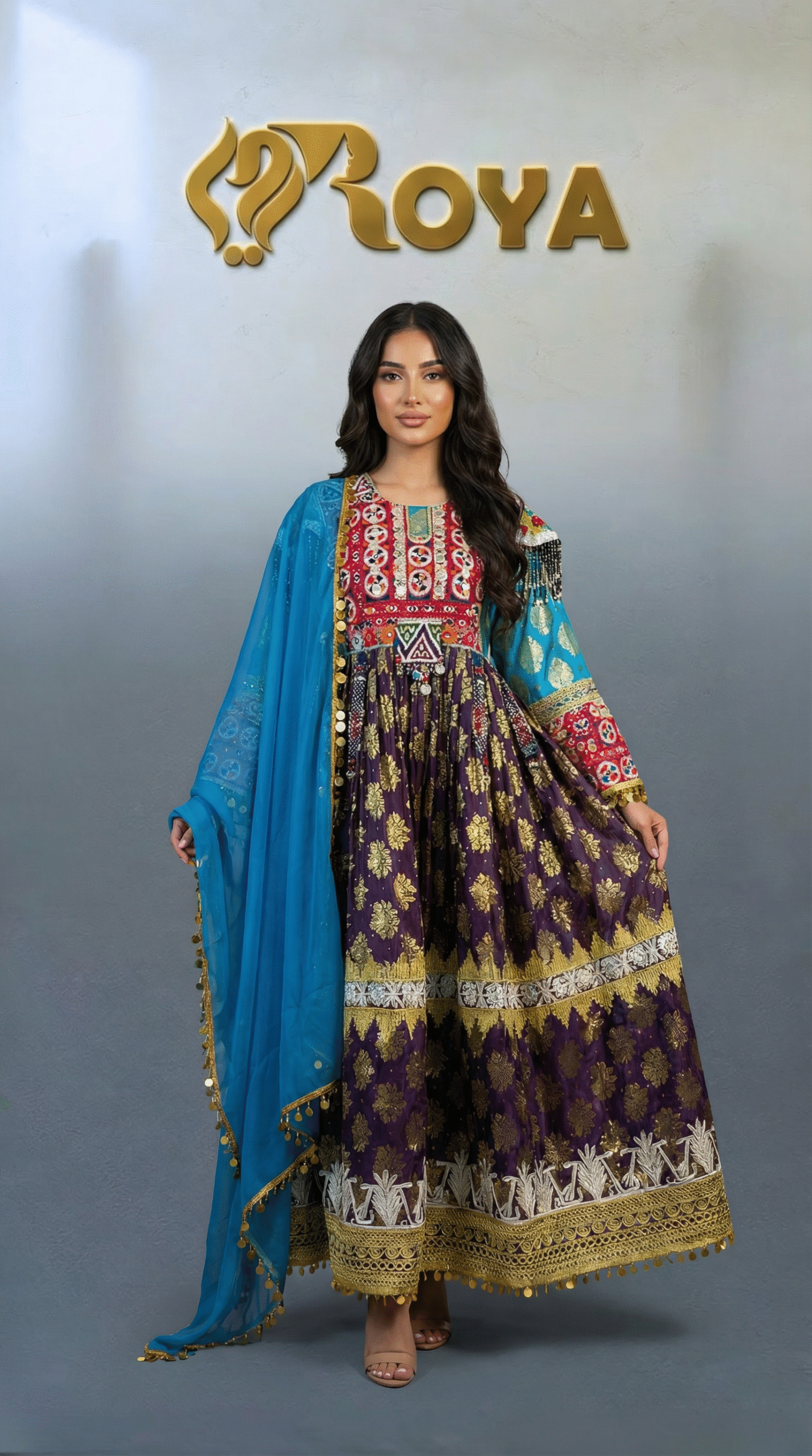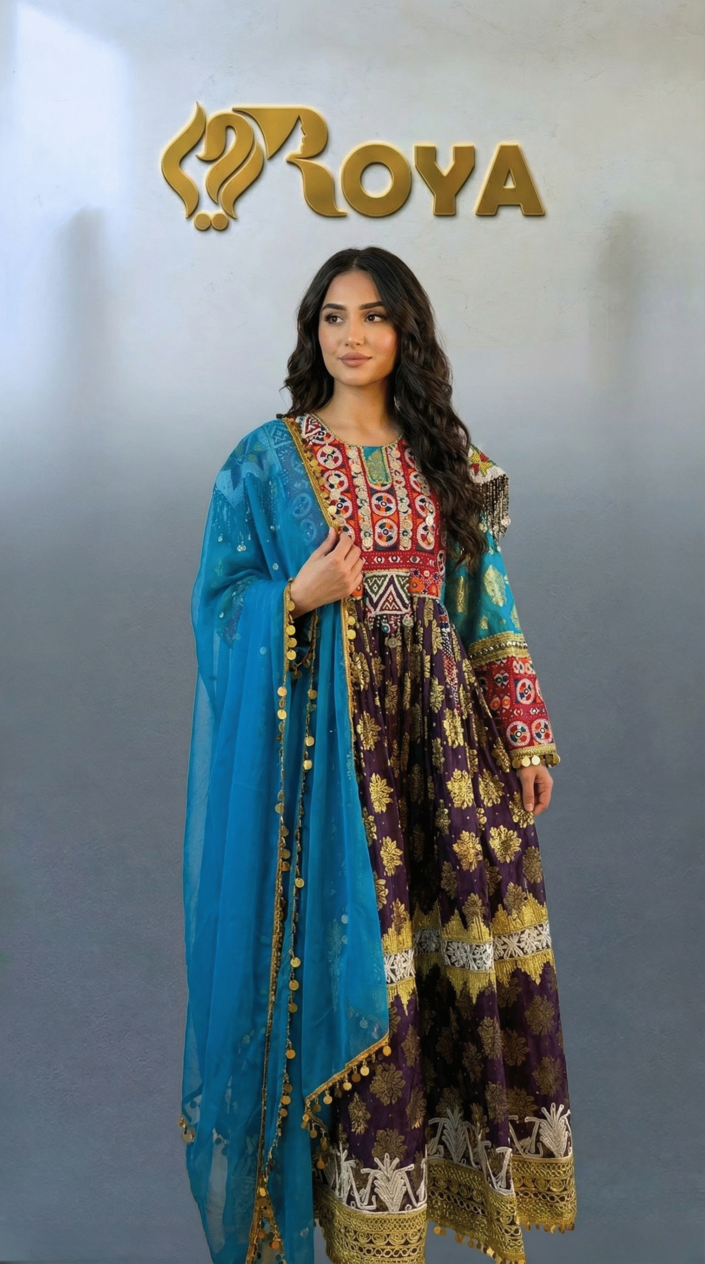A luxurious Afghan Kochi dress featuring rich purple tones, vibrant multicolor embroidery, and a graceful turquoise dupatta. A perfect blend of tradition and elegance.