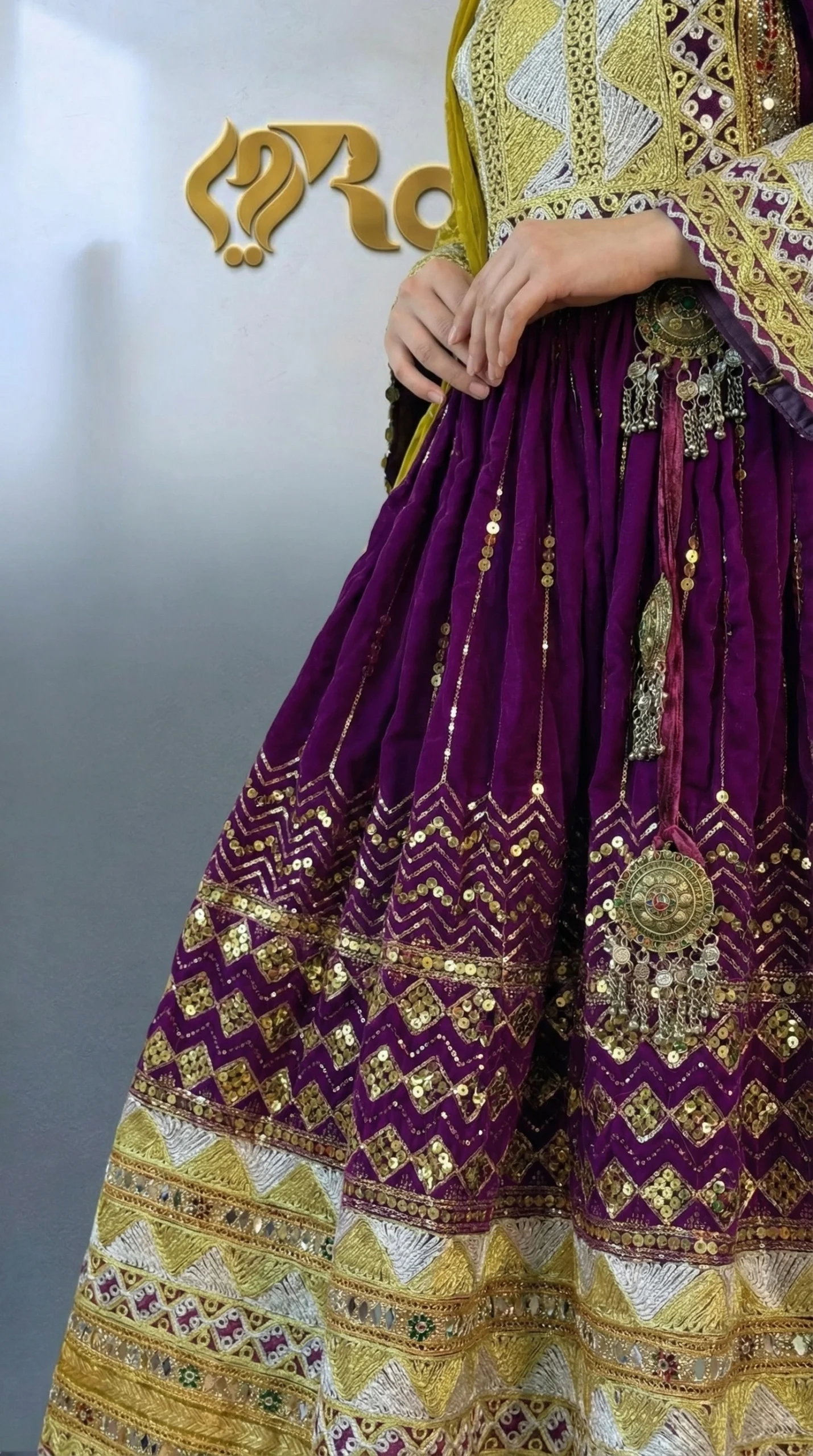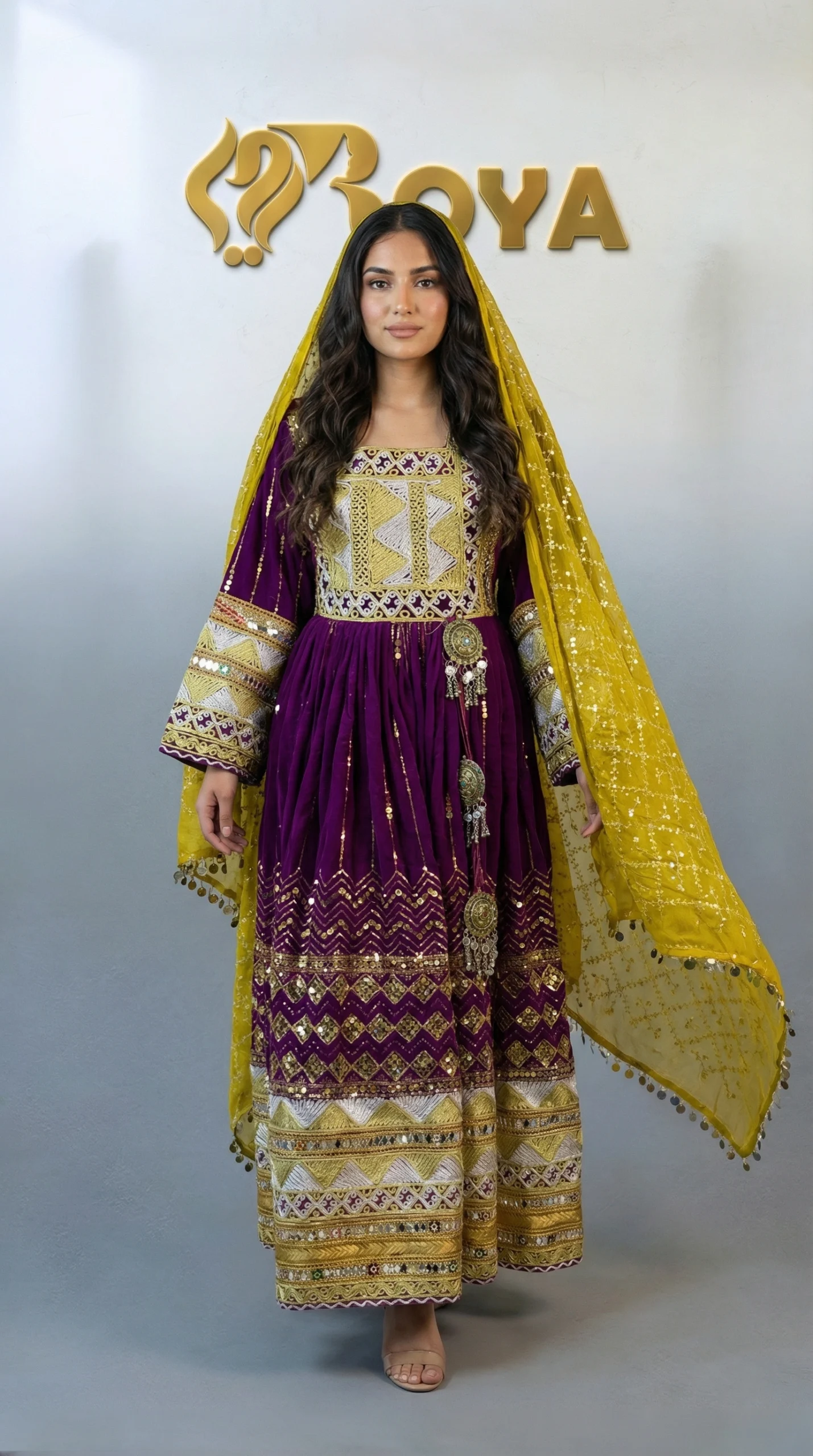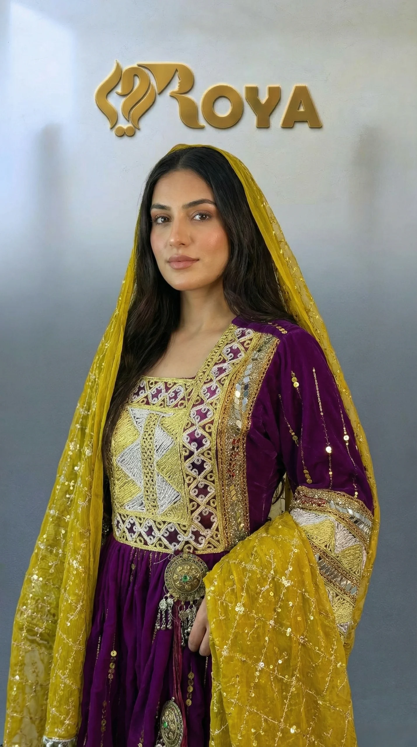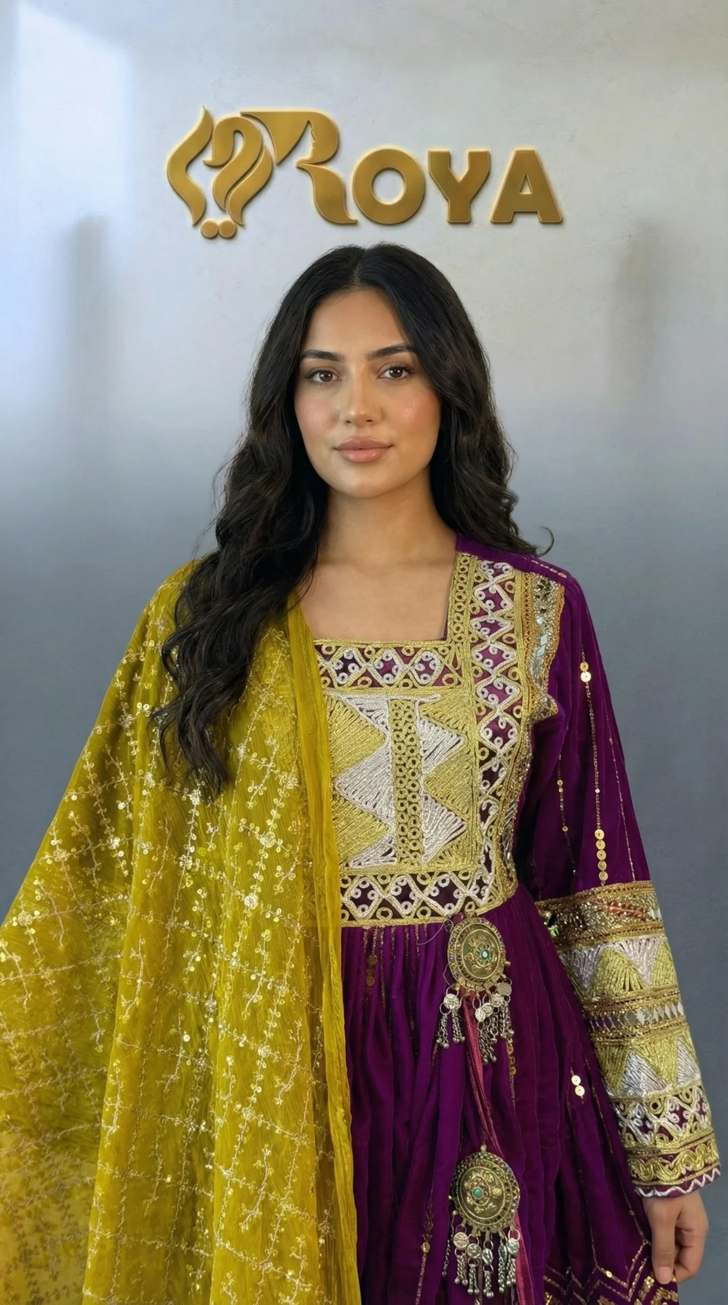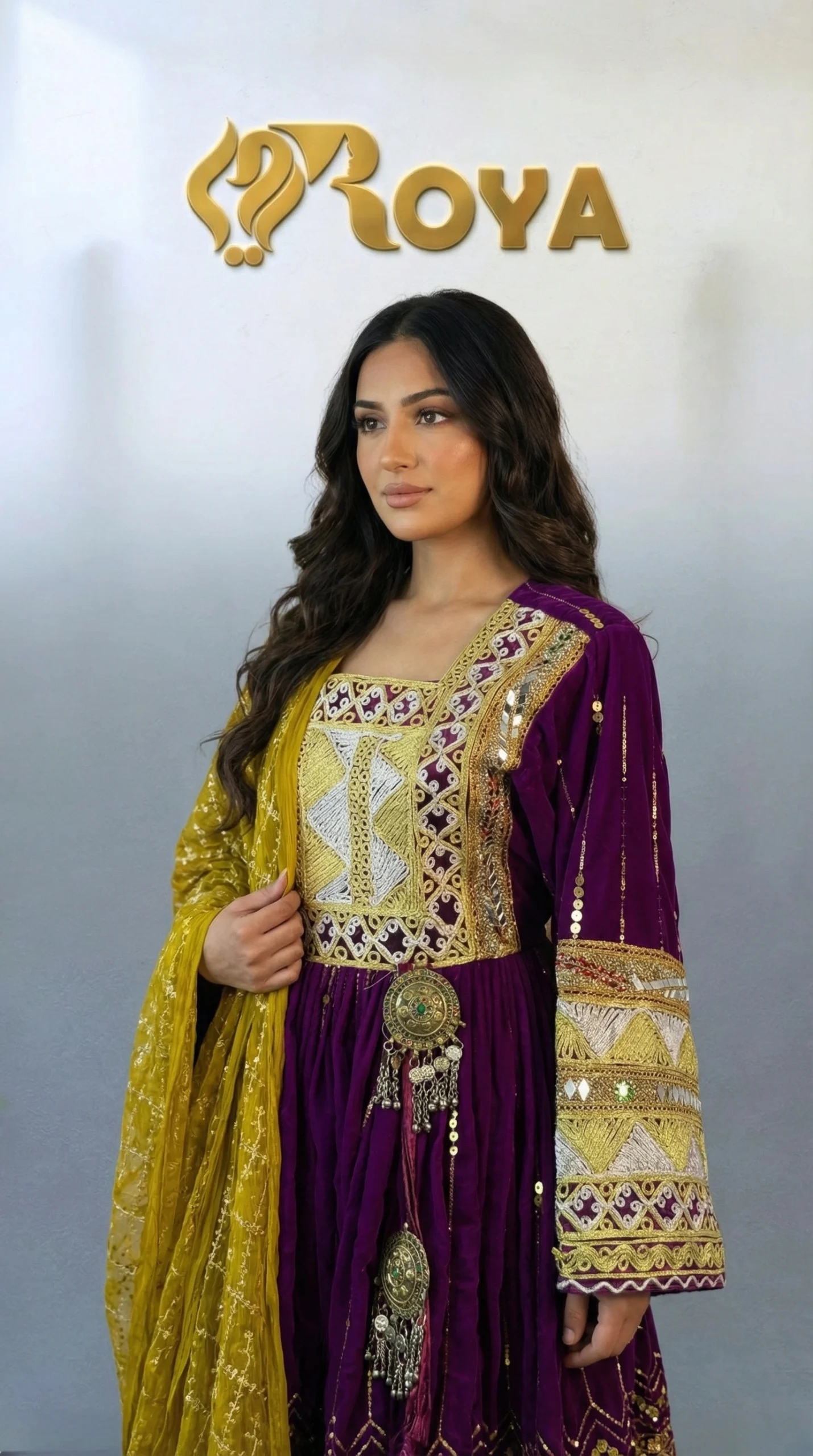 The Mariam Kochi Dress is a beautiful celebration of Afghan tradition and craftsmanship. Designed in a deep royal purple tone, this dress features intricate Kochi embroidery across the bodice, sleeves, and hem, enhanced with decorative metallic and mirror-style accents that add depth and cultural charm.
